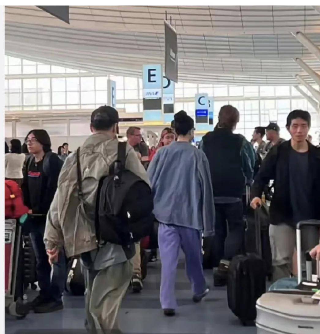 在排队进站的时候,两个人就不能并排走了,谢霆锋走到了前面,后面的王菲则是推着一个很大的箱子。